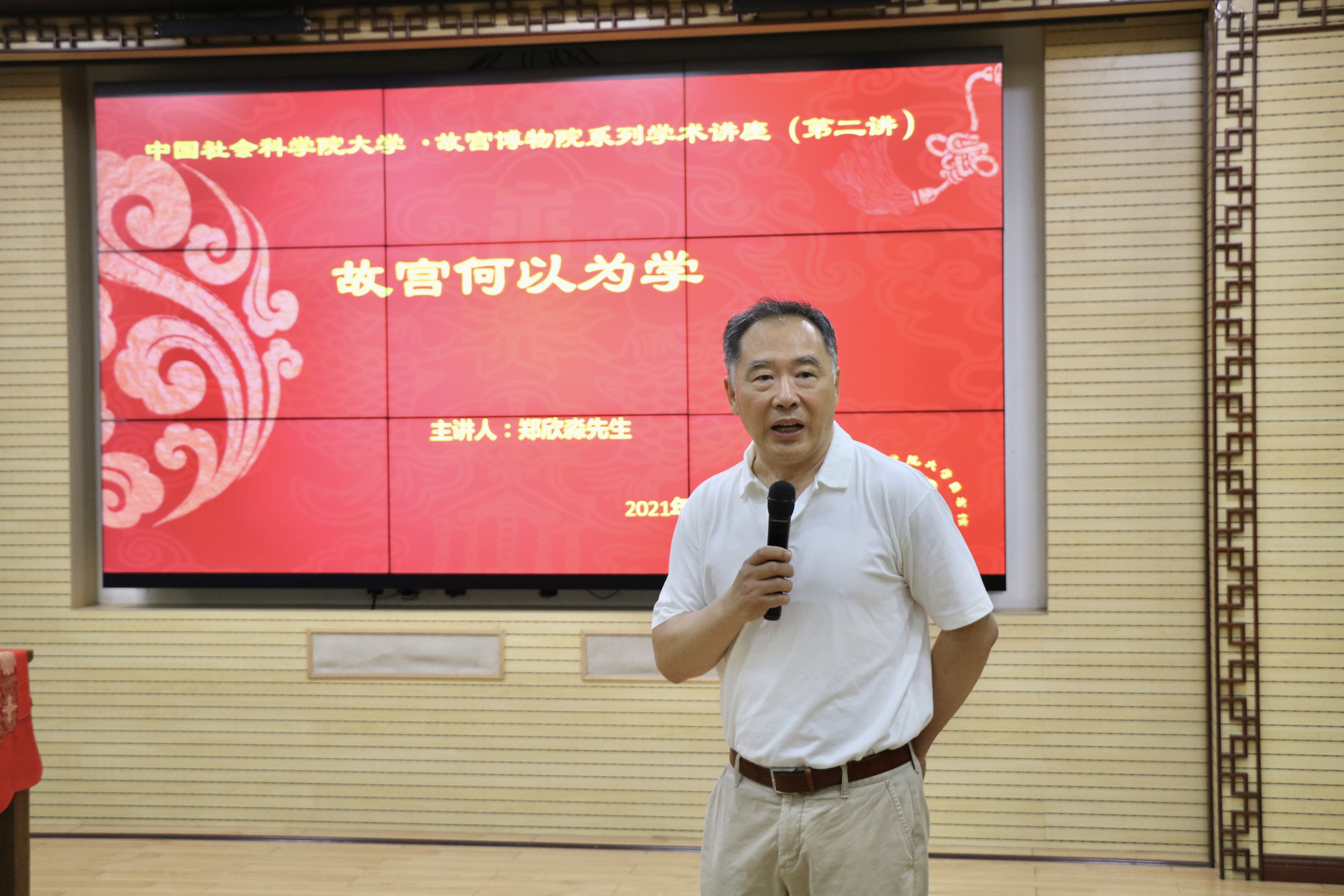 郑欣淼先生的讲座围绕故宫文物、故宫古建筑以及故宫博物院三部分展开。针对故宫为文物这一定义指出:清宫遗存都有其价值,宫廷收藏不仅具有政治意义还有珍宝、财富意义,同时其文化传承意义也不容忽视。要突破传统文物观念,全面认识故宫文物藏品的价值。随后,郑先生以故宫建筑为切入点,引出“大故宫”概念。“大故宫”是近年来故宫学研究中所形成的一个共识,故宫古建筑及遗存所具有的集大成性使得故宫是一个文化整体,这也成为故宫学方法论的哲学基础。打通学科界限,防止文物研究的“碎片化”,是故宫学的精要所在。在故宫博物院这一部分的讲述中,郑先生通过对故宫博物院院史和中国博物馆事业发展过程的梳理,表明了故宫博物院的象征意义和重要地位,并指出故宫遗产保护与故宫博物院发展是相互依存、相互促进的关系,因此故宫博物院在今后的发展中要处理好“宫”与“院”的关系。郑先生还提到,海峡两岸两个故宫同根同源,故宫学恰是连接“一个故宫”和“两个博物院”的纽带,也是两个博物院交流合作的内在动力。郑先生最后提到:故宫不是纯粹的学术机构而是一座与实践充分结合的机构,故宫学提出已经十八年,故宫学与中国社会科学院大学的合作交流的意义重大,故宫学未来发展的希望在青年人、在大学。