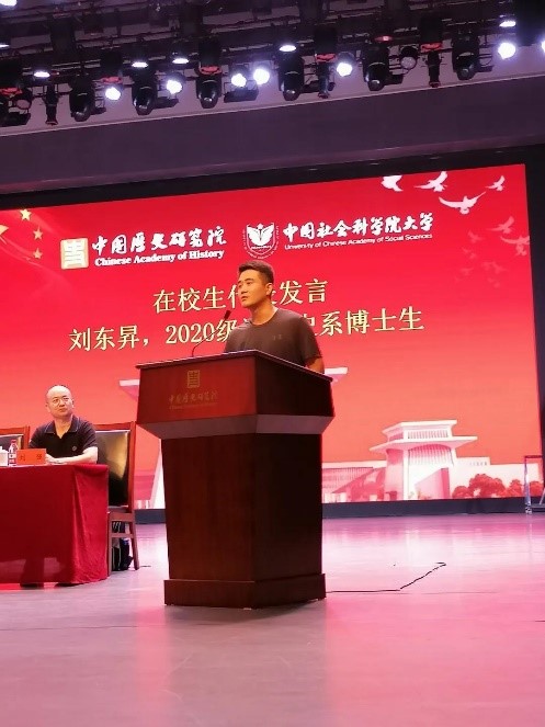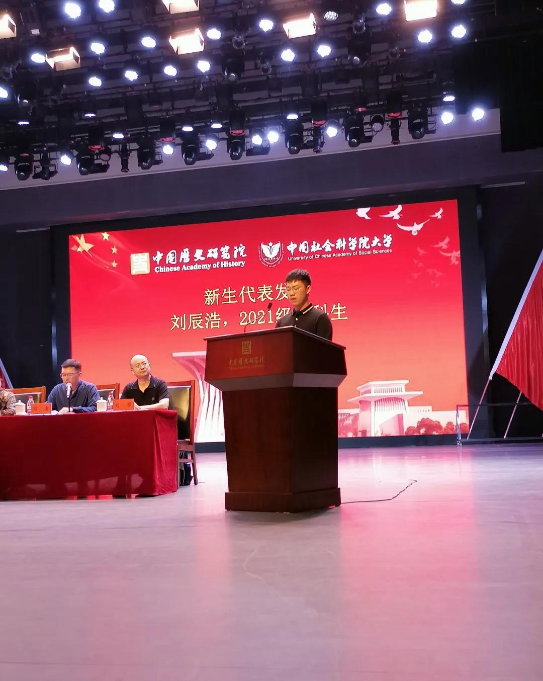 2021级刘辰浩同学作为本科新生代表分享了自己对历史研究院和对中国社会科学院大学的崇敬之情,并展望未来,他相信在中国社会科学院大学的诸位老师的教导下,我们一定能做到习总书记教导的“学史明理、学史增信、学史崇德、学史力行”,成长为担当民族复兴大任的时代新人。