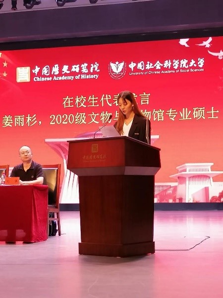 在校生代表2020级文物与博物馆专业硕士生姜雨杉同学在发言中提出,研究生以科学研究为主要任务,要明确目标,潜心学习,保持严谨的科学态度,恪守学术道德底线。