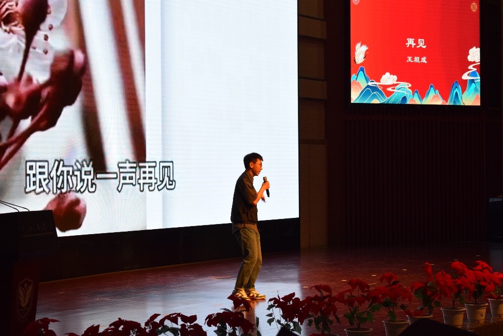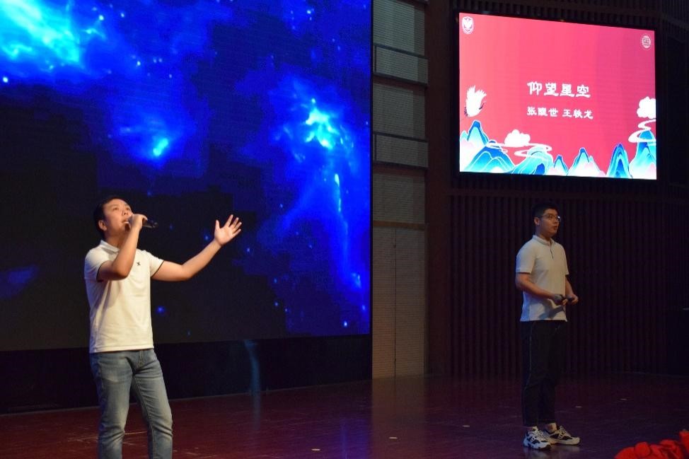 炽翎街舞社以舞蹈《drama》表达出对勇气的赞美和坚定执着的人生态度。2021级硕士章泽玮古琴演奏《酒狂》,传达出“富贵功名不稀罕,此心不为天公管”的壮志凌云、气吞山河之叹。2022级硕士张醒世、王轶龙演唱《仰望星空》,以温厚的歌声为毕业生送上暖意与祝福。2021级硕士王坦成带来《再见》,既是珍重回忆、告别师友也是满怀信心、再启新程,歌曲将现场气氛推向高潮。