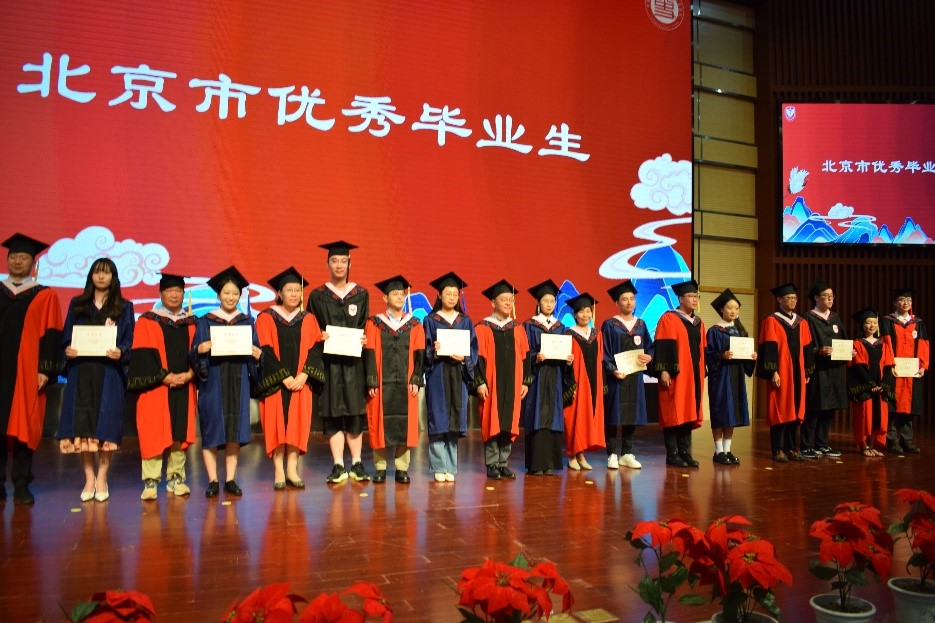 学院副院长袁宝龙宣读北京市优秀毕业生名单。学院教师赵春青、王树芝、乌云高娃、刘源、郭物、贾衣肯、何利群、王昱廷、刘强为北京市优秀毕业生颁发证书。