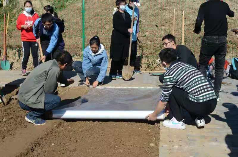 在农业技术指导员张老师的指导下,同学们很快完成了对土地的翻新。接下来,张老师对同学们进行了更加专业的农业指导:建造田垄与土地覆膜。最初,由于同学们对田垄的具体要求不够清楚,将田垄建得过高并且有些歪曲。但在张老师及时提醒之下,同学们将田垄修直压平后成功完成。同学们在土地上均匀地撒上菠菜和大葱种子后,用塑料薄膜对土地进行覆盖以保持水分并用泥土和石块将薄膜四周压住。农业实践到此告一段落。