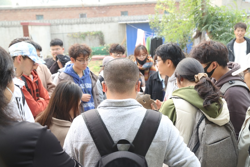 在考古工地参观完后,大家步行来到了距离工地不远处考古队在村子的驻地,这里存放着许多富位遗址出土的遗物。在院中摆放着几筐经过分类的陶器残片,常老师为同学们讲解了这些陶片背后蕴含的历史信息,它们或是代表本地的考古学文化,或是移民带过来的中原器型,甚至还有长江流域的代表性器物,小小的陶片反映了古代中国各地区文化的互动交流。在讲解后同学们也上手摸了这些陶片,感受不同材质、不同纹饰的手感差别,留下了深刻的印象。