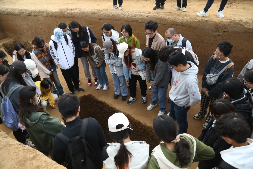 考古工地还特意保留了一处商代墓葬向同学们展示,许多非考古专业的同学第一次近距离参观墓葬,都感觉非常新奇,大家里三圈外三圈地将其围了起来。常老师就墓葬的形制、葬俗、随葬品等方面为大家进行了讲解。