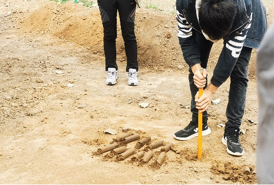 考古工地的老师为同学们展示了“大名鼎鼎”的洛阳铲的使用。打孔、落铲、提土、辨别土样,老师的动作行云流水,吸引着围观的同学跃跃欲试。几位同学上手体验了洛阳铲,第一感受就是铲子太沉,使用过程也不太顺利,没想到看起来简单的事情却并不太容易,洛阳铲的使用也需要熟能生巧呀。