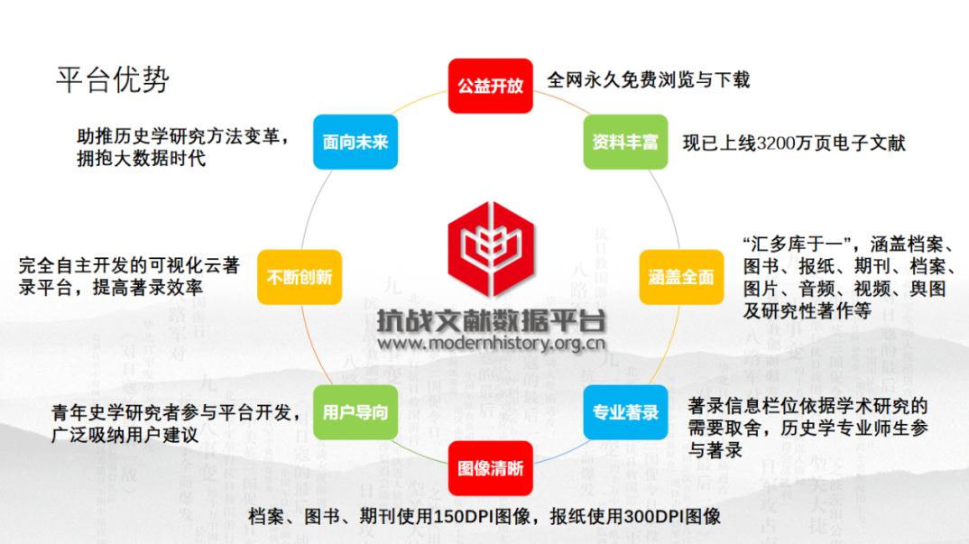 罗敏老师首先说明了建设这一平台的原因。这不仅与如今中国人民的抗战贡献被西方漠视与遗忘有关,还有对进一步推动中国抗战史研究的考量。抗战时期的各类文献材料零星散于世界各地,其保存与整理状况也十分堪忧,加之各种主客观因素的限制,中国抗战史学界的数据库建设也长期落后。因此,建立一个收集、整理、传播抗日战争历史文献的数据平台意义重大、势不容缓。在党和国家领导人以及相关部门的高度关注下,为了贯彻落实习近平总书记关于抗日战争史研究的重要讲话精神,国家社科规划办专门设立了抗日战争研究专项工程,批准由中国社会科学院、国家图书馆及国家档案局主办,中国社会科学院近代史研究所承办的“抗日战争与近代中日关系文献数据平台”。自此,“抗日战争与近代中日关系文献数据平台”正式形成。